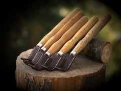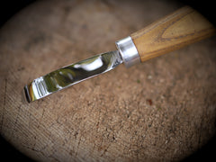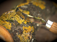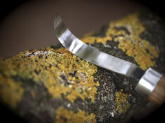 Das Gewicht der auf einem japanischen Wasserschleifstein geschliffenen Klinge und des gedrechselten Eschenholzgriffes sind perfekt ausbalanciert und bieten eine sehr gute Haptik und Genauigkeit bei feinsten Schnitzbewegungen aus dem Handgelenk.
