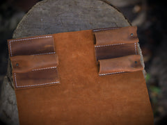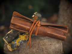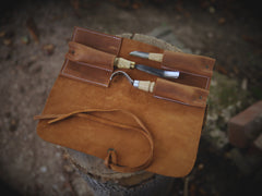 Diese mit 3 flachen und 3 runden Einschüben gefertigte Tasche schützt ihre Werkzeuge sicher! Ob Meißel, Lederwerkzeuge oder Kochutensilien. Diese Leder-Rolle bietet eine zuverlässige Aufbewahrungsmöglichkeit in der Werkstatt oder auf Reisen.